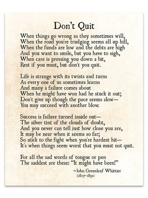 DON’T QUIT BY JOHN GREENLEAF WHITTIER TITLE: DON’T QUIT AUTHOR: JOHN GREENLEAF WHITTIER PUBLICATION: 1920 Share this: Share on X (Opens in new window) X Share on Facebook (Opens in new window) Facebook Like Loading... Related Published by Anneka Minelli Lledo View all posts by Anneka Minelli Lledo